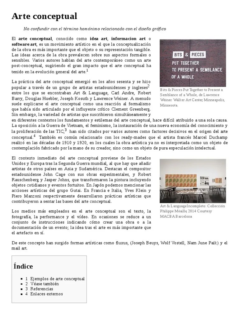 La superación de las ideas racionalistas de la ilustración y el paso a conceptos más subjetivos e individuales, partiendo del movimiento romántico y cristalizando en la obra de autores como... El arte conceptual requiere un espectador que reconozca la ironía, la parodia y la burla. En este movimiento artístico se apunta siempre a que la experiencia de quien observa la obra traspase más allá de la materia, por tanto corresponden a una especie de proposición analítica donde las intenciones del artista se apropian del papel protagónico y se abre paso a una contemplación reflexiva. Apr 06, 2019 · arte conceptual. La superación de las ideas racionalistas de la ilustración y el paso a conceptos más subjetivos e individuales, partiendo del movimiento romántico y cristalizando en la obra de autores como. Se trata de una forma de arte centrada en la idea, en el sentido y el significado, y no tanto en la técnica, los materiales y la obra de arte en sí misma. El arte conceptual ha existido desde hace siglos.